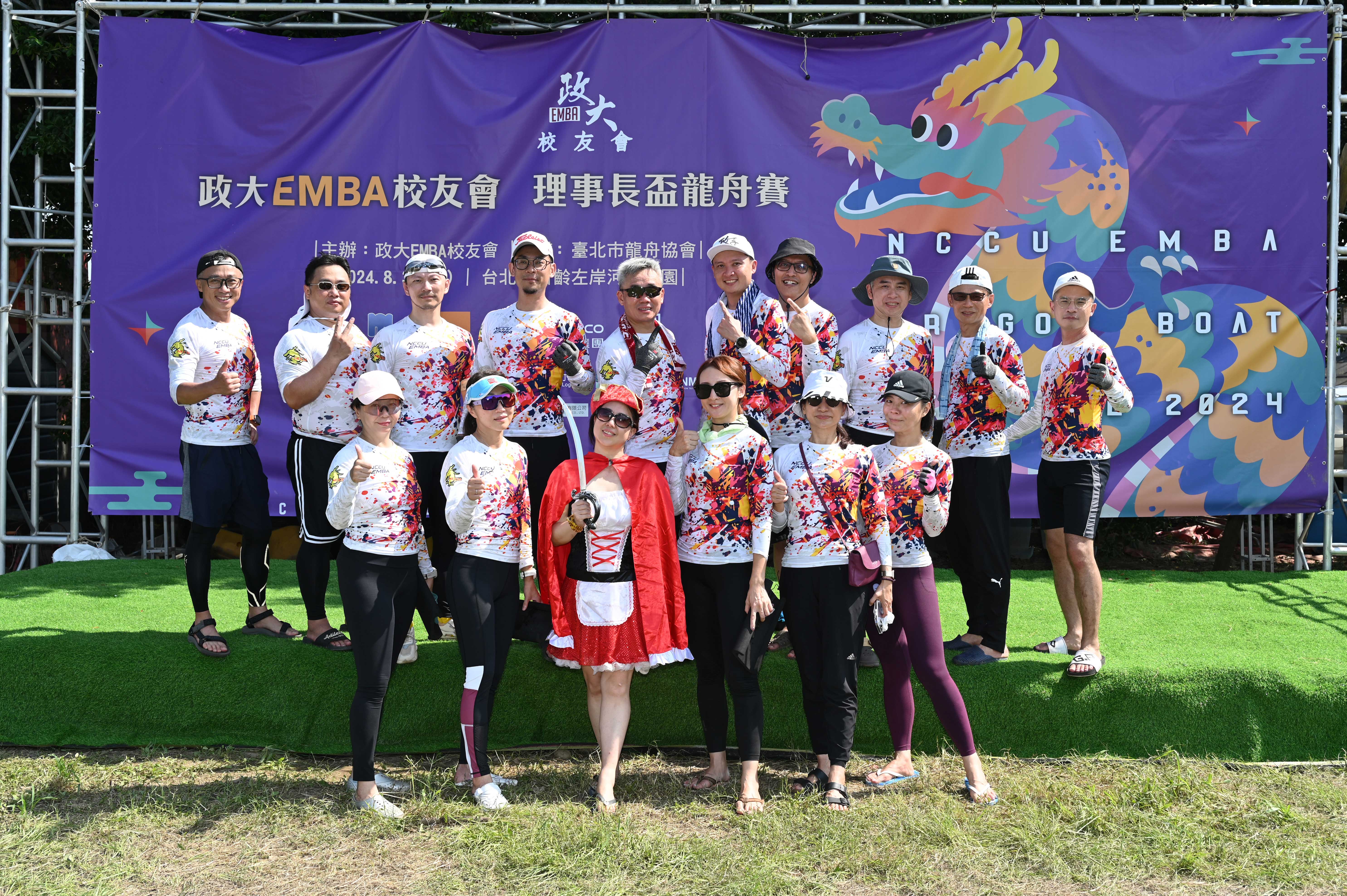 尤其政大EMBA校友會理事長盃龍舟賽雖然參賽者並非職業運動員,但卻展現專業的競技運動該有的技能與精神,除了由台北市龍舟協會承辦,大會還安排課程,包含基礎課程與團隊整合訓練,除了競賽技巧,由政大全企成員組成的「花枝拿波萬」鼓手還特地扮成神鬼奇航的造型,不僅划出第五名的好成績更是龍舟賽最吸睛的隊伍。