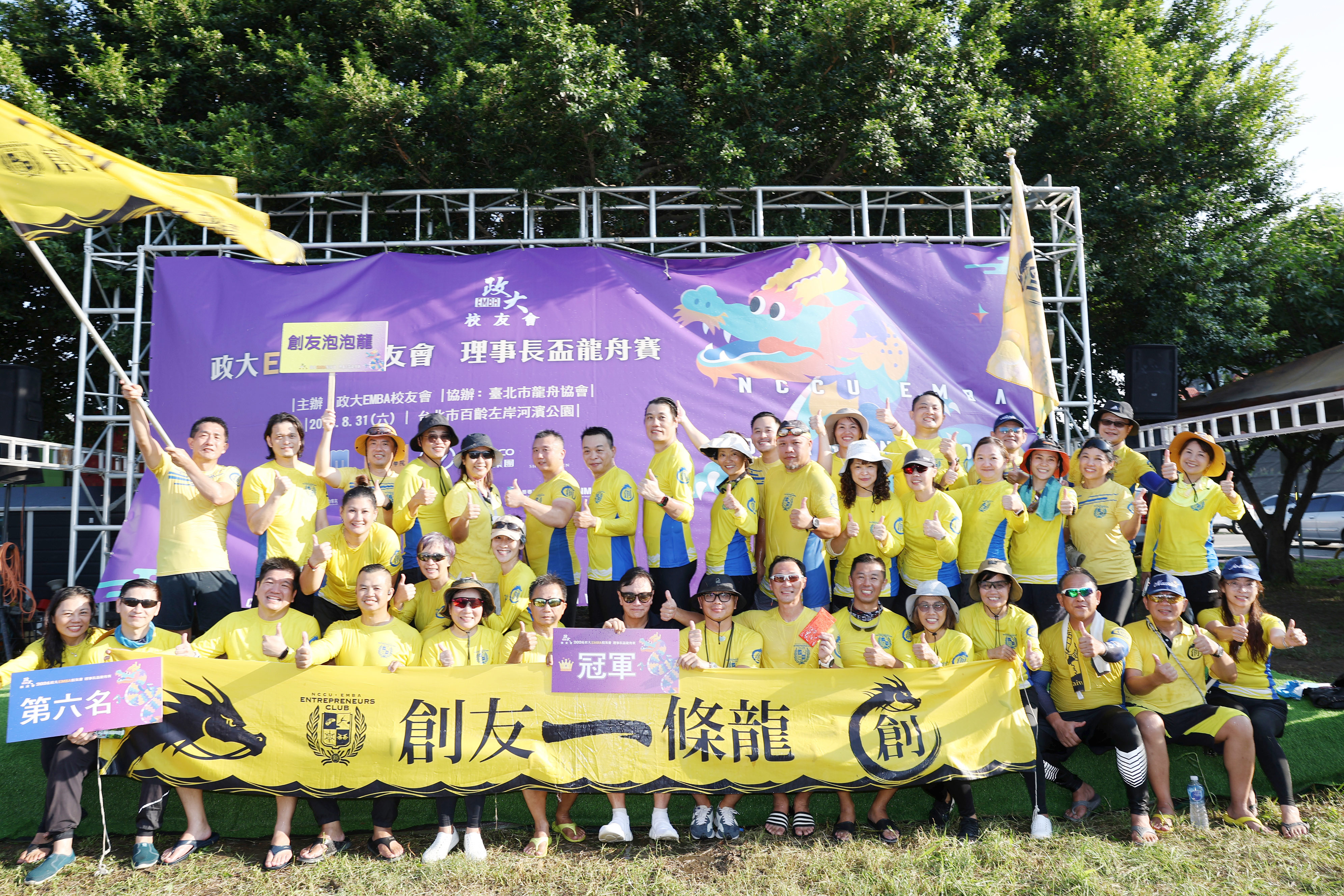 (2024年8月31日,即時訊)政大EMBA校友會理事長盃龍舟賽邁入第四年,第四屆賽事於8/31(六)於台北市百齡左岸河濱盛大展開。本次賽事參賽人數創下新高,共有來自政大EMBA、政大國際金融學院、台大EMBA、台師大EMBA、台科大EMBA與長庚EMBA共17個參賽隊伍,不僅五校菁英運動咖精銳盡出,其中還不乏師長、院長及副校長一同參與。延續往年的熱血精神在歷經一整天的賽事後,政大「創友一條龍」以1’08”77的成績拿下冠軍;亞軍則為政大「就是愛玩水」成績為1’09”91,差距之小也讓現場觀賽者緊張不已。由政大EMBA創業主班跨屆組成的「創友一條龍」大隊長馬連凱表示,睽違四年再次拿下冠軍,背後靠的就是大夥一週三次的練習,雖然早上六點就開划非常的辛苦,但是努力絕對是值得的,尤其對手越來越強,隊員們更是不敢懈怠。
